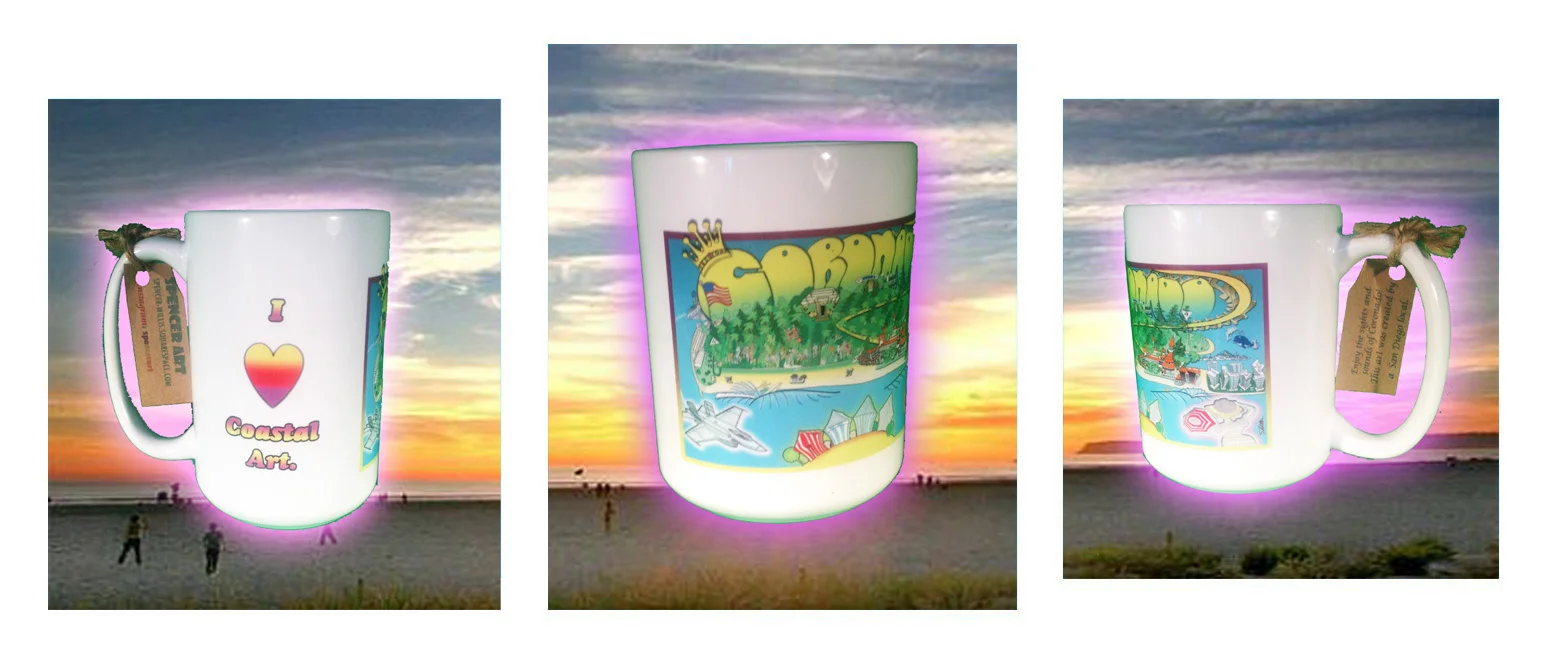 Welcome to Coronado! An affluent San Diego Coastal community that was founded in 1885. The land was purchased by Elisha Spurr Babcock, Hampton L. Story and Jacob Gruendike, Wanting to create a resort community, in 1886, they organized the Coronado Beach Company. By 1888 they had built the Hotel del Coronado and the city became a major resort destination. This city boast some of San Diego's greatest architectural structures, tourist attractions, and military arrangements, which are creatively rendered in the coastal art creation below: